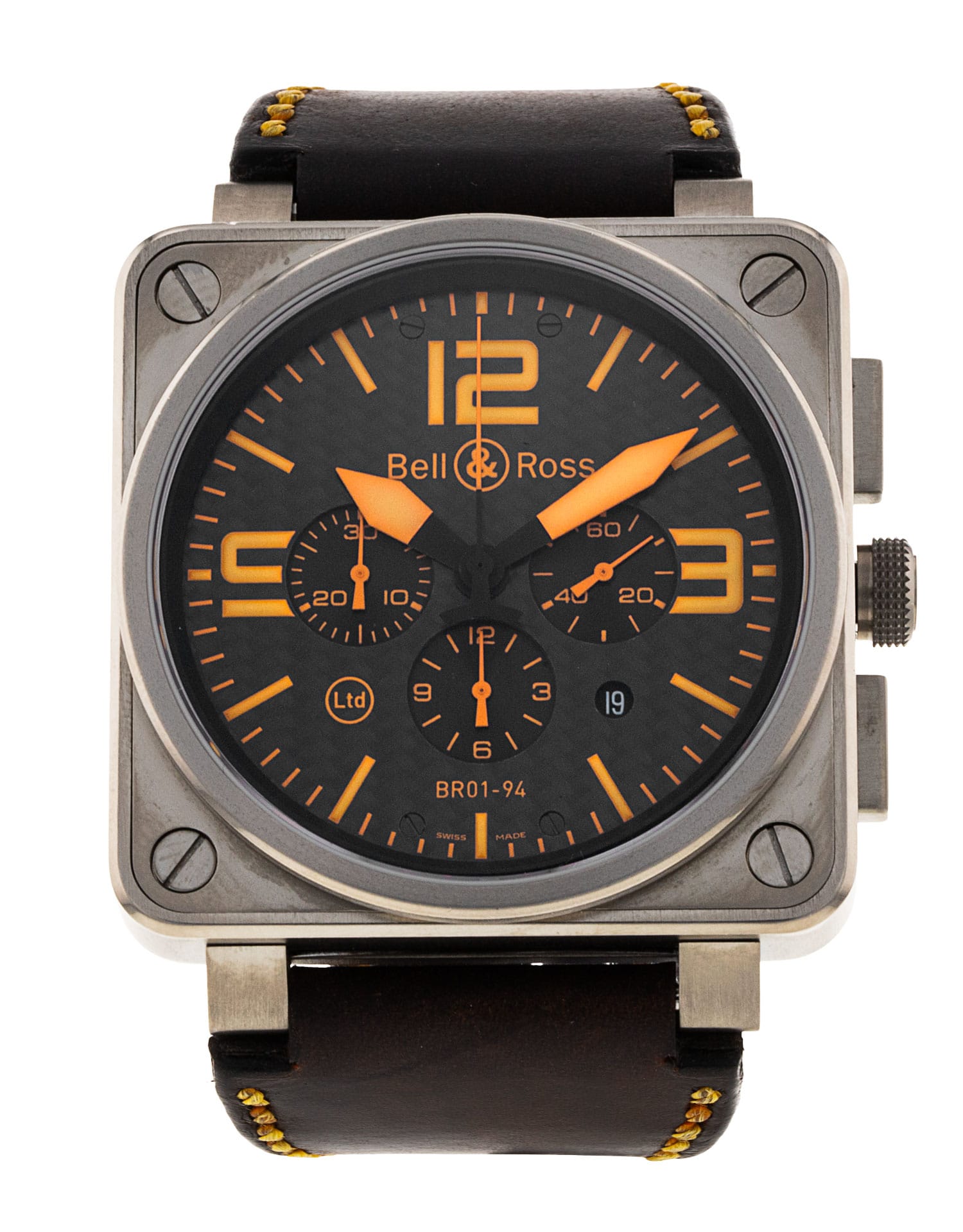 This Bell and Ross BR01-94 Chronograph BR01-94 has a black & orange dial and a leather strap. This Bell and Ross has undergone a thorough inspection of water resistance, accuracy, functionality and condition to determine the level of reconditioning required to meet our strict standards. It has also been referenced against technical documents and manufacturer records where available to ensure authenticity and a clean history. Our watches have a 24-month warranty for your peace of mind, in conjunction with any remaining manufacturer’s warranty from new or from service.