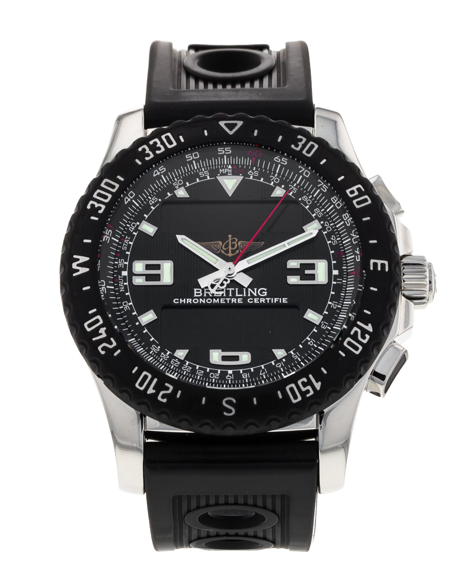 This Breitling Airwolf A78364 has a black quarter arabic dial and a rubber strap. This Breitling has undergone a thorough inspection of water resistance, accuracy, functionality and condition to determine the level of reconditioning required to meet our strict standards. It has also been referenced against technical documents and manufacturer records where available to ensure authenticity and a clean history. All our watches have a 24-month warranty for your peace of mind.