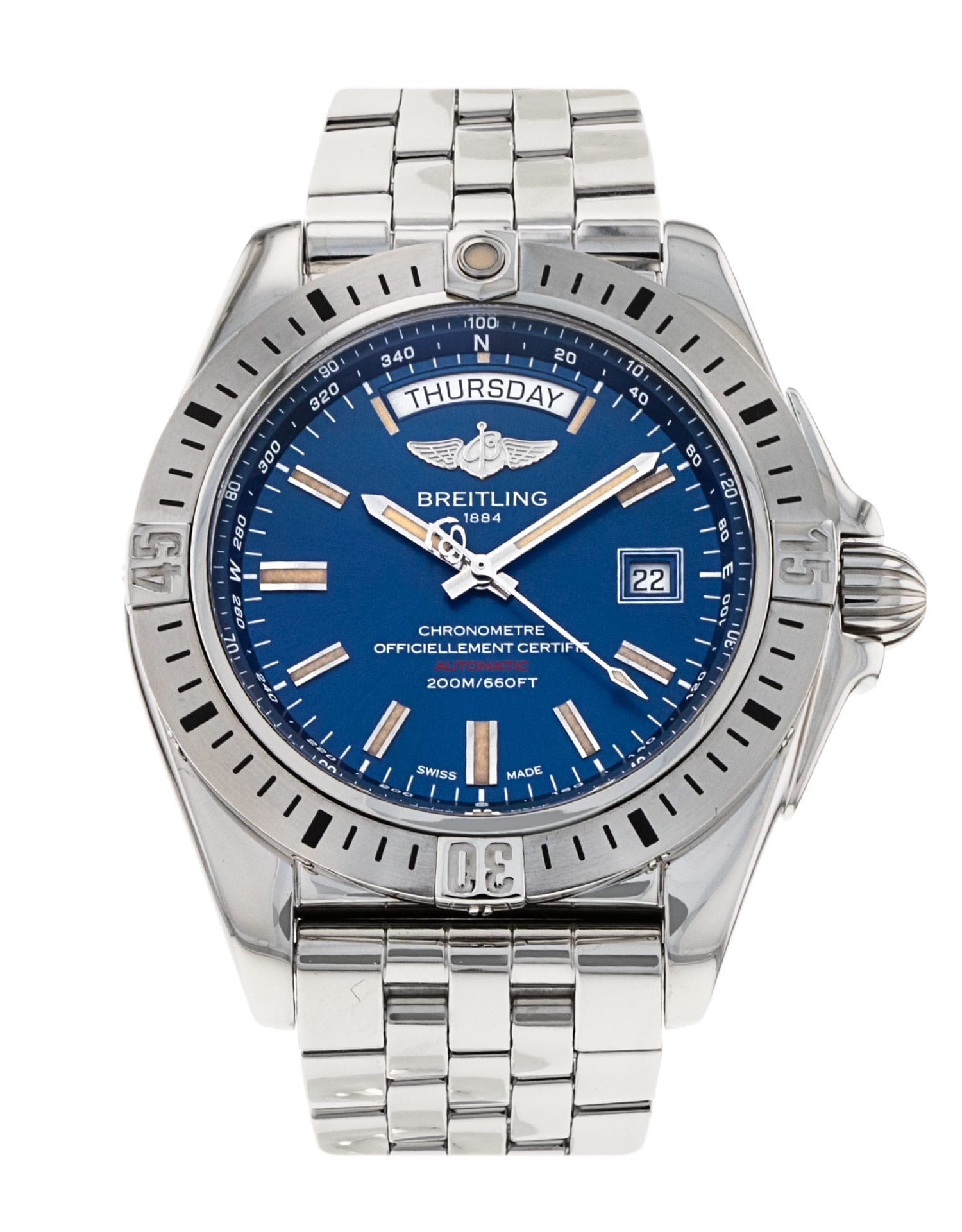 This Breitling Galactic 44 A45320 has a blue baton dial and a bracelet strap. This Breitling has undergone a thorough inspection of water resistance, accuracy, functionality and condition to determine the level of reconditioning required to meet our strict standards. It has also been referenced against technical documents and manufacturer records where available to ensure authenticity and a clean history. All our watches have a 24-month warranty for your peace of mind.