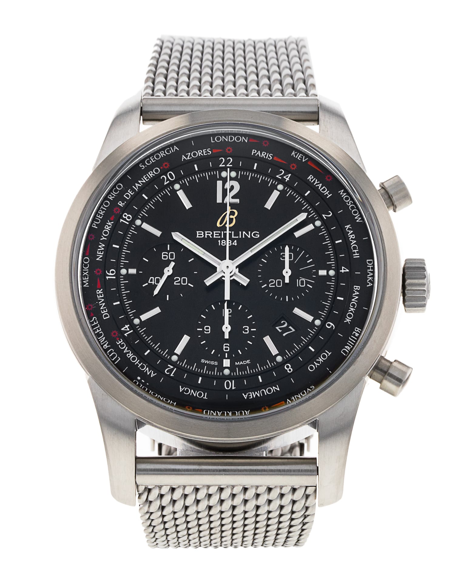 This Breitling Transocean Chronograph AB0510 has a black baton dial and a bracelet strap. This Breitling has undergone a thorough inspection of water resistance, accuracy, functionality and condition to determine the level of reconditioning required to meet our strict standards. It has also been referenced against technical documents and manufacturer records where available to ensure authenticity and a clean history. All our watches have a 24-month warranty for your peace of mind.
