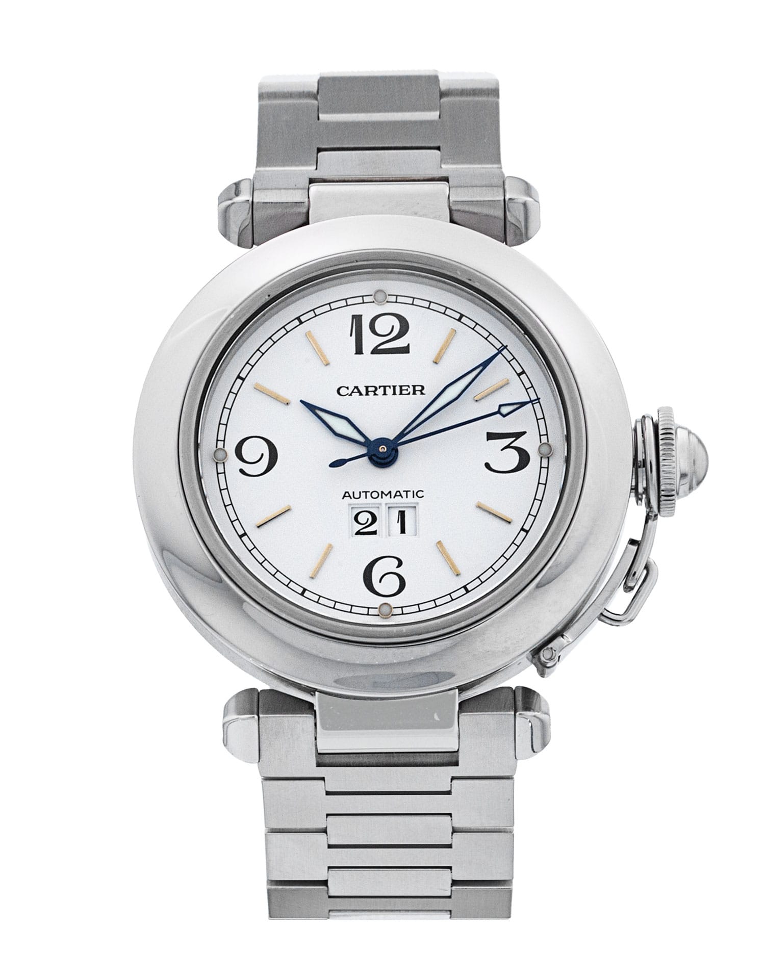 This Cartier Pasha W31044M7 has a white quarter arabic dial and a bracelet strap. This Cartier has undergone a thorough inspection of accuracy, functionality and condition at our Cartier certified service centre to determine the level of reconditioning required to meet our strict standards. It has also been checked against our records to ensure authenticity. All our watches have a 24-month warranty for your peace of mind.