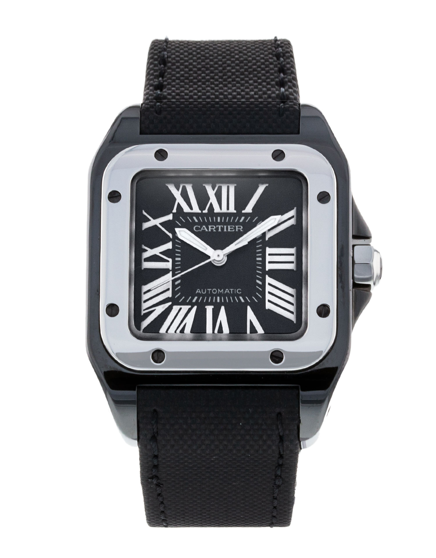 This Cartier Santos 100 W2020008 has a black roman numeral dial and a leather strap. This Cartier has undergone a thorough inspection of accuracy, functionality and condition at our Cartier certified service centre to determine the level of reconditioning required to meet our strict standards. It has also been checked against our records to ensure authenticity. All our watches have a 24-month warranty for your peace of mind.