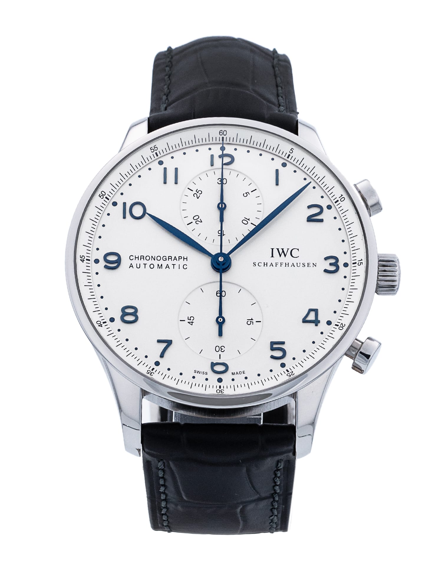 This IWC Portugieser Chrono IW371446 has a silver arabic dial and a leather strap. This IWC has undergone a thorough inspection of accuracy, functionality and condition at our IWC certified service centre to determine the level of reconditioning required to meet our strict standards. It has also been checked against our records to ensure authenticity. All our watches have a 24-month warranty for your peace of mind.