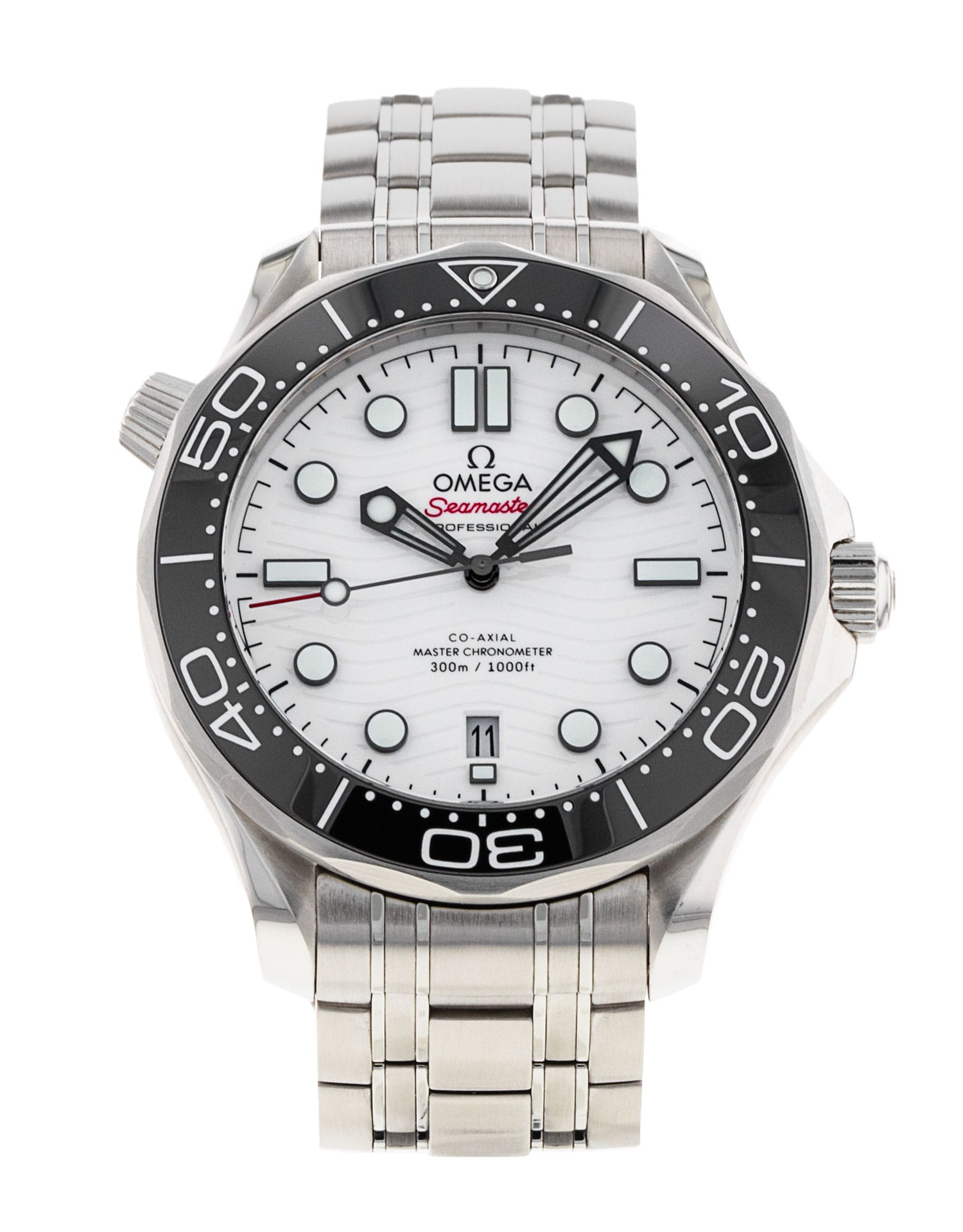 This Omega Seamaster Diver 300m 210.30.42.20.04.001 has a white dial and a bracelet strap. This Omega has undergone a thorough inspection of accuracy, functionality and condition at our Omega certified service centre to determine the level of reconditioning required to meet our strict standards. It has also been checked against our records to ensure authenticity. All our watches have a 24-month warranty for your peace of mind.