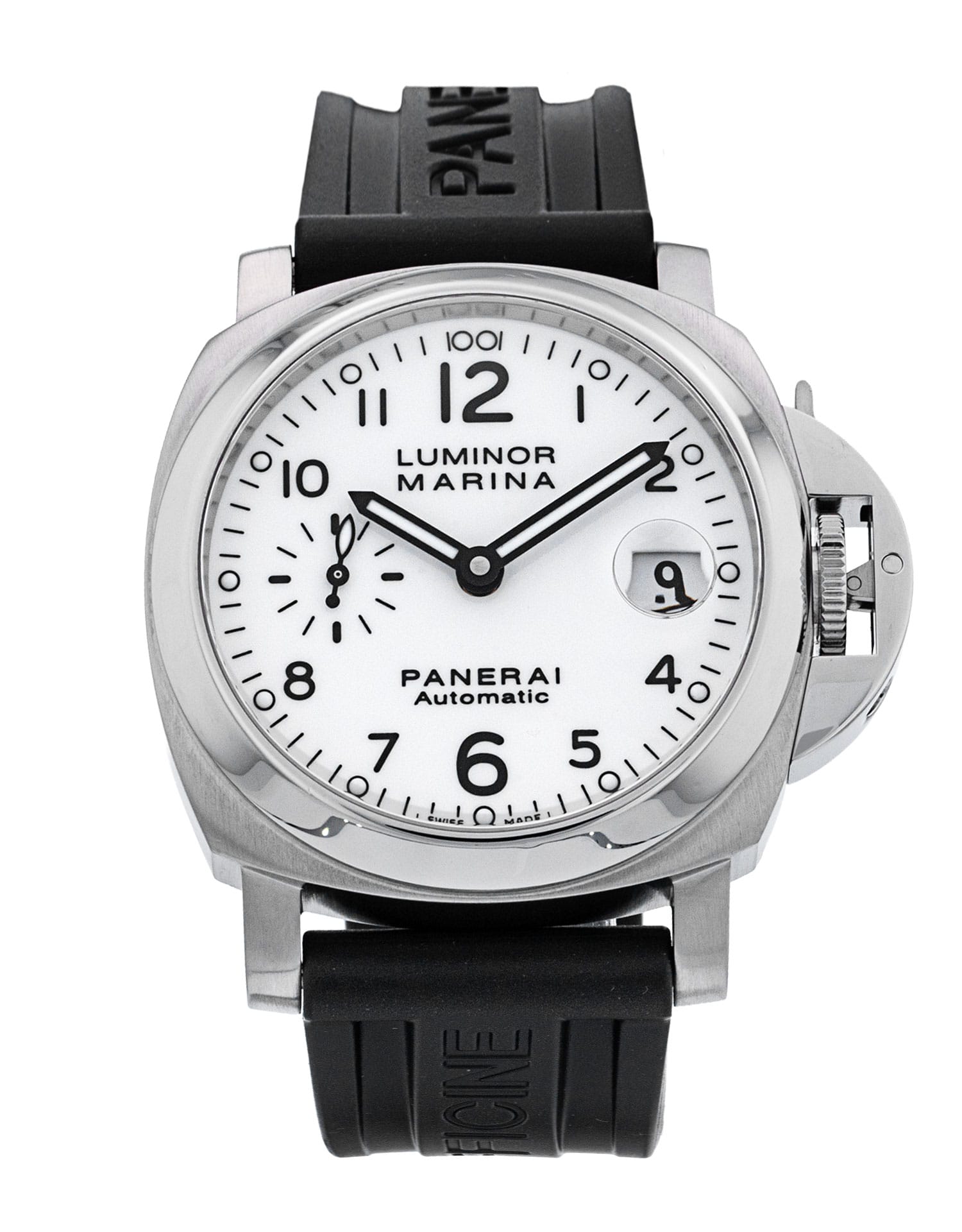 This Panerai Luminor Marina PAM00049 has a white arabic dial and a rubber strap. This Panerai has undergone a thorough inspection of accuracy, functionality and condition at our Panerai certified service centre to determine the level of reconditioning required to meet our strict standards. It has also been checked against our records to ensure authenticity. All our watches have a 24-month warranty for your peace of mind.