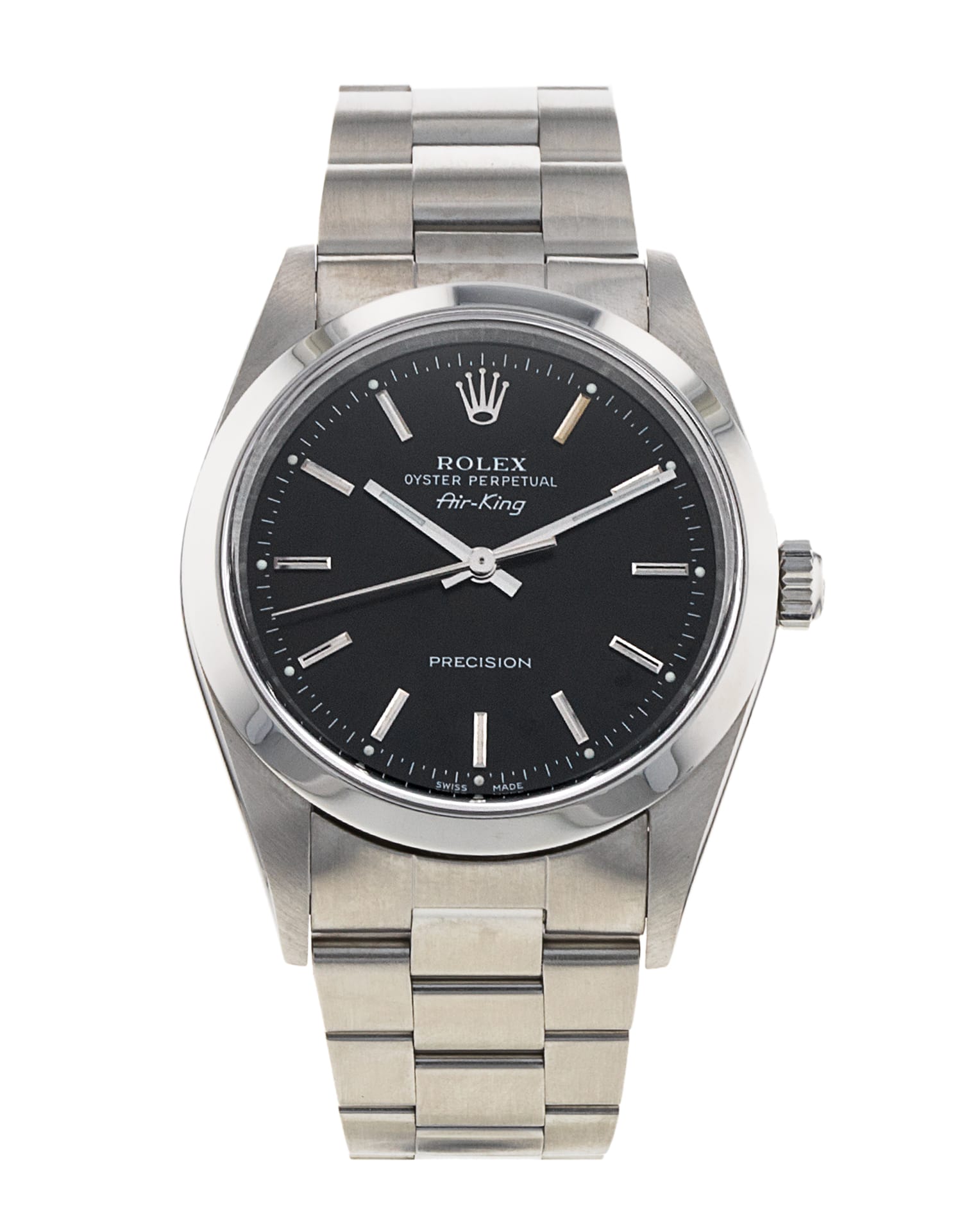 This Rolex Air-King 14000 has a black baton dial and a bracelet strap. This Rolex has undergone a thorough inspection of water resistance, accuracy, functionality and condition to determine the level of reconditioning required to meet our strict standards. It has also been referenced against technical documents and manufacturer records where available to ensure authenticity and a clean history. All our watches have a 24-month warranty for your peace of mind. One of our skilled polishing technicians has removed marks on the case and bracelet of this watch, brought about by daily wear and tear, which is why this watch does not come with the remaining manufacturer’s warranty.