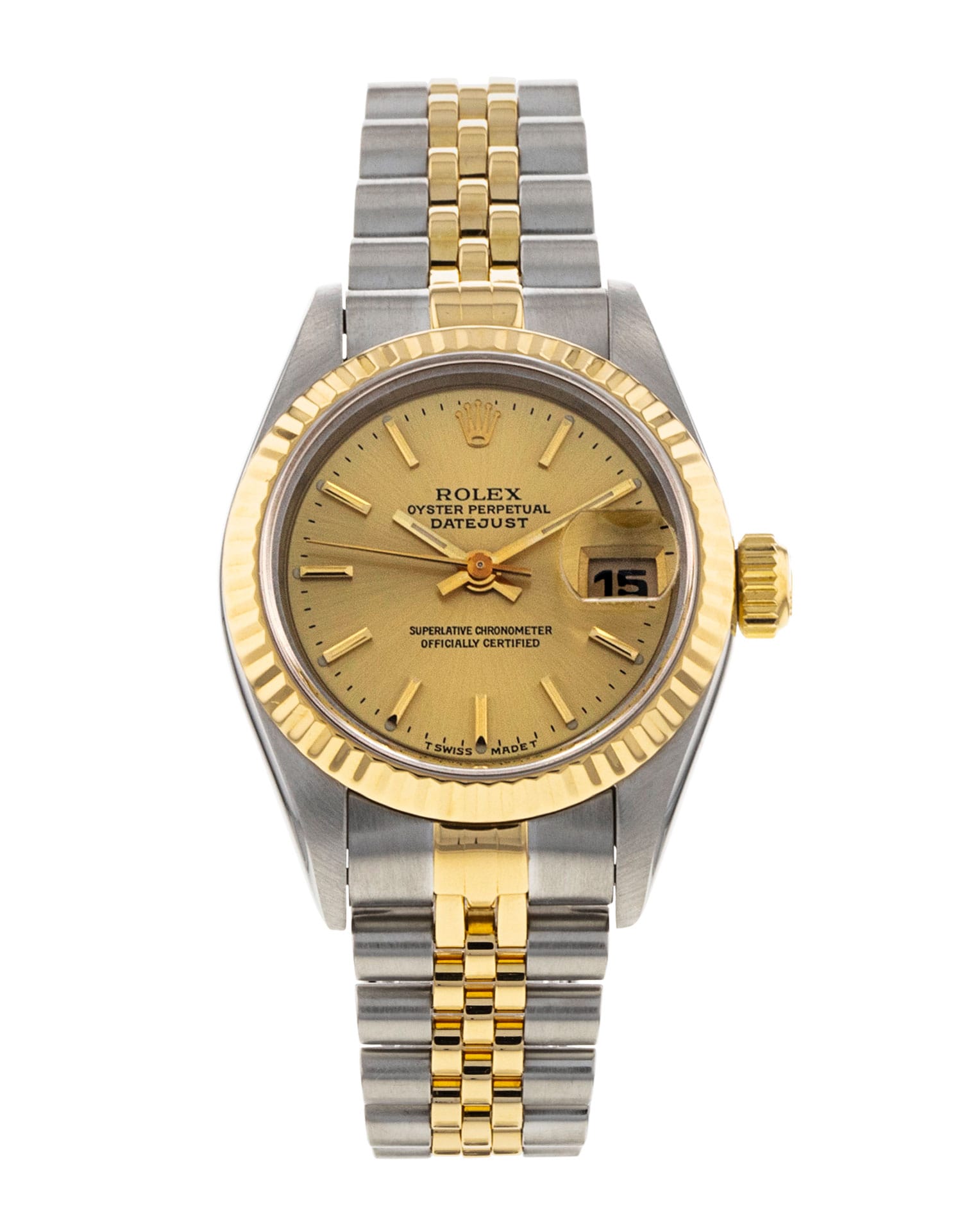 This Rolex Datejust Lady 69173 has a champagne baton dial and a bracelet strap. This Rolex has undergone a thorough inspection of water resistance, accuracy, functionality and condition to determine the level of reconditioning required to meet our strict standards. It has also been referenced against technical documents and manufacturer records where available to ensure authenticity and a clean history. All our watches have a 24-month warranty for your peace of mind. One of our skilled polishing technicians has removed marks on the case and bracelet of this watch, brought about by daily wear and tear, which is why this watch does not come with the remaining manufacturer’s warranty.