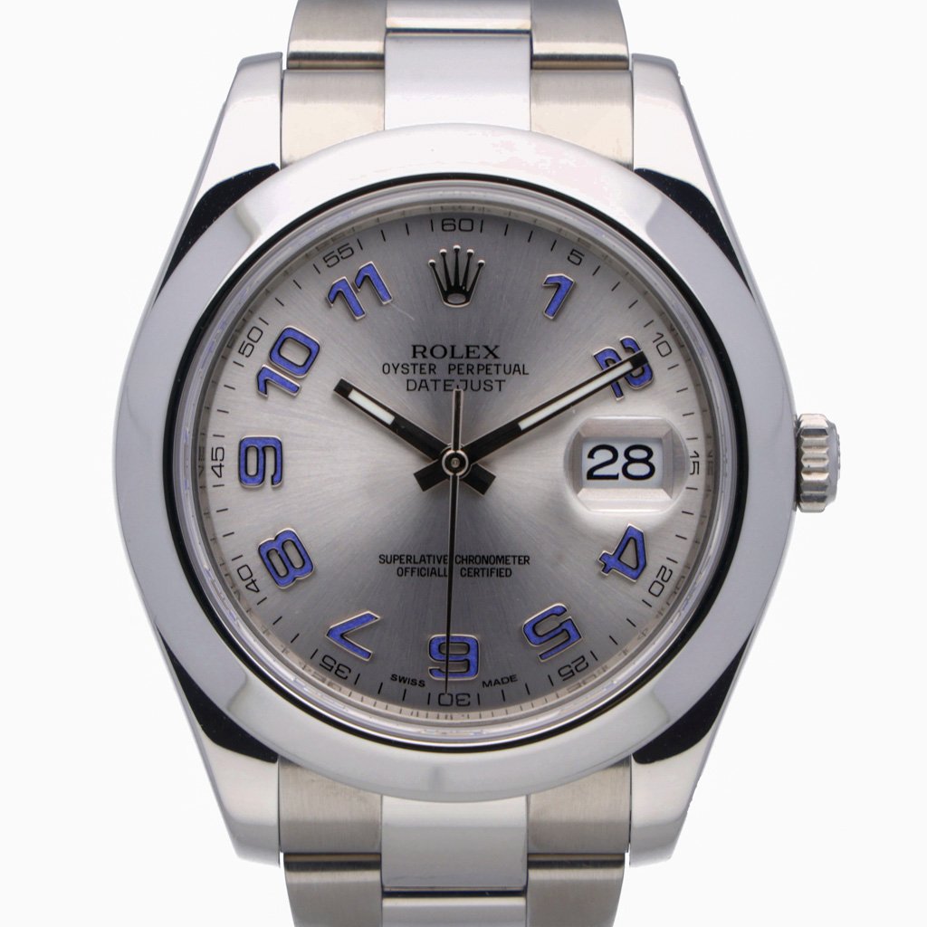 This Rolex Datejust II 116300 has a rhodium arabic dial and a bracelet strap. This Rolex has undergone a thorough inspection of water resistance, accuracy, functionality and condition to determine the level of reconditioning required to meet our strict standards. It has also been referenced against technical documents and manufacturer records where available to ensure authenticity and a clean history. All our watches have a 24-month warranty for your peace of mind. One of our skilled polishing technicians has removed marks on the case and bracelet of this watch, brought about by daily wear and tear, which is why this watch does not come with the remaining manufacturer’s warranty.