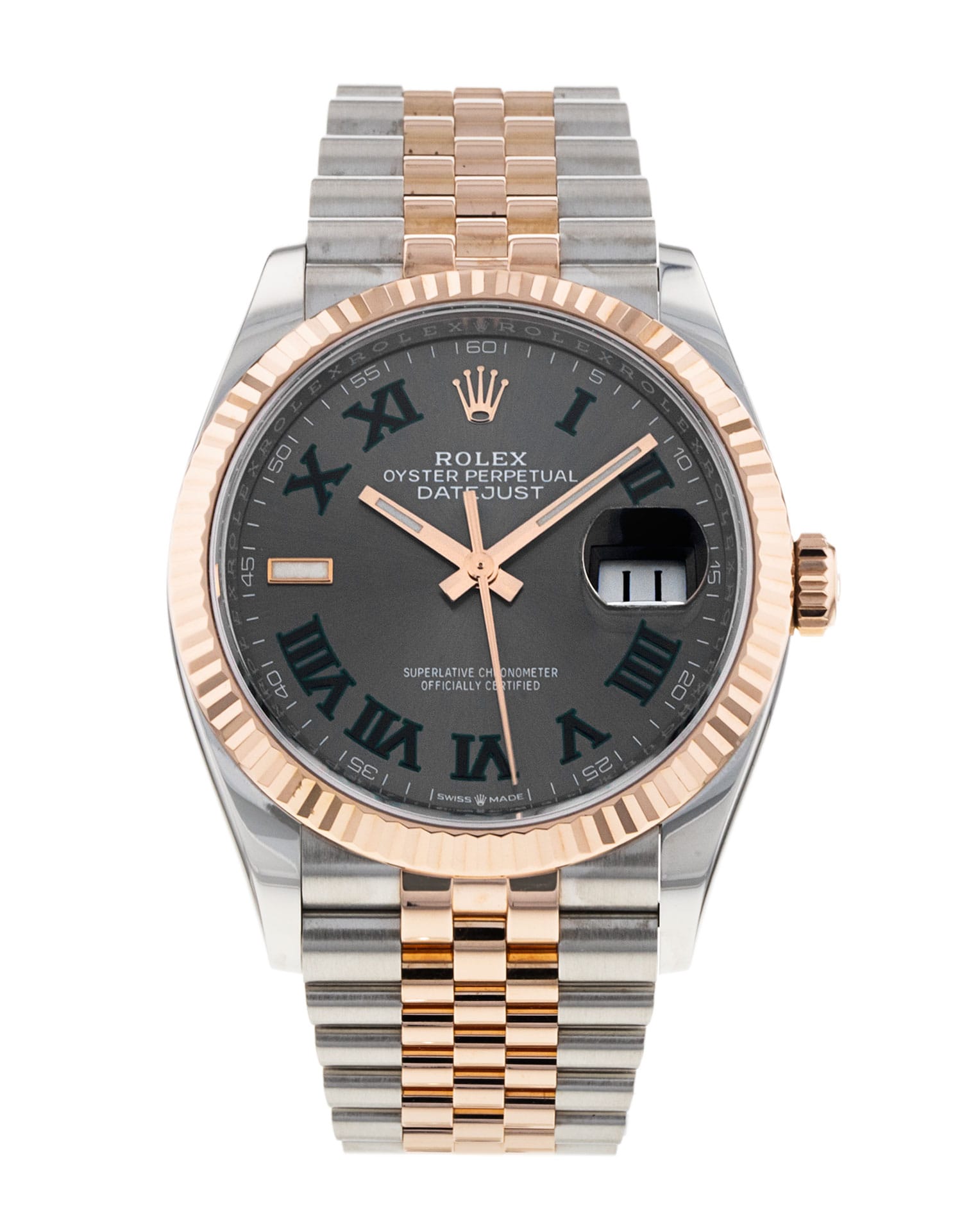 This Rolex Datejust 126231 has a slate roman numeral dial and a bracelet strap. This Rolex has undergone a thorough inspection of water resistance, accuracy, functionality and condition to determine the level of reconditioning required to meet our strict standards. It has also been referenced against technical documents and manufacturer records where available to ensure authenticity and a clean history. All our watches have a 24-month warranty for your peace of mind. One of our skilled polishing technicians has removed marks on the case and bracelet of this watch, brought about by daily wear and tear, which is why this watch does not come with the remaining manufacturer’s warranty.
