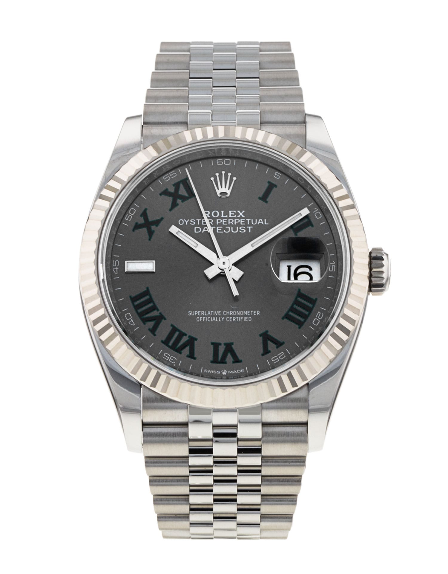 This Rolex Datejust 126234 has a slate roman numeral dial and a bracelet strap. This Rolex has undergone a thorough inspection of water resistance, accuracy, functionality and condition to determine the level of reconditioning required to meet our strict standards. It has also been referenced against technical documents and manufacturer records where available to ensure authenticity and a clean history. Our watches have a 24-month warranty for your peace of mind, in conjunction with any remaining manufacturer’s warranty from new or from service. To maintain the manufacturer’s warranty on this watch, it has not been polished in our service centre.