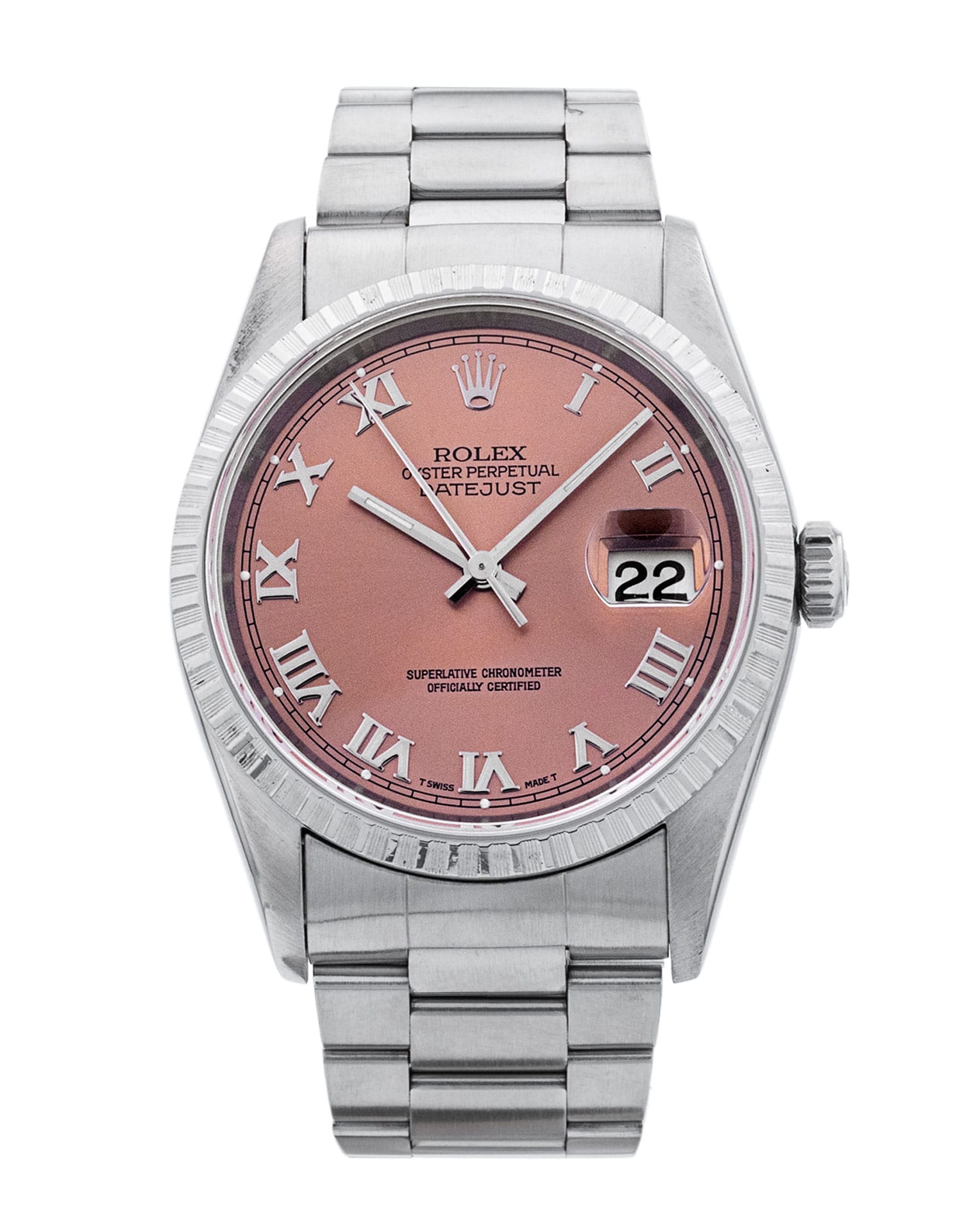 This Rolex Datejust 16220 has a salmon roman numeral dial and a bracelet strap. This Rolex has undergone a thorough inspection of water resistance, accuracy, functionality and condition to determine the level of reconditioning required to meet our strict standards. It has also been referenced against technical documents and manufacturer records where available to ensure authenticity and a clean history. All our watches have a 24-month warranty for your peace of mind. One of our skilled polishing technicians has removed marks on the case and bracelet of this watch, brought about by daily wear and tear, which is why this watch does not come with the remaining manufacturer’s warranty.