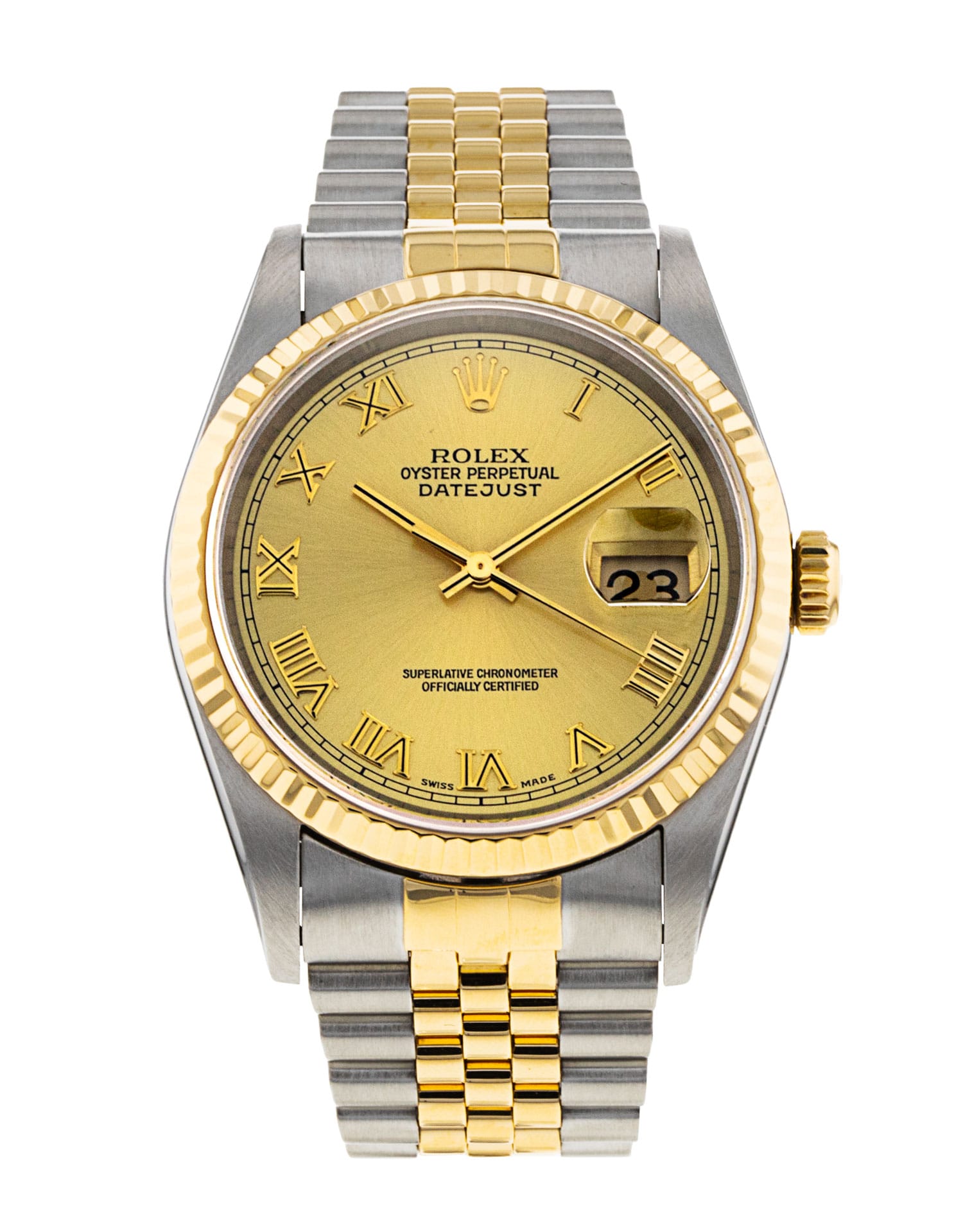 This Rolex Datejust 16233 has a champagne roman numeral dial and a bracelet strap. This Rolex has undergone a thorough inspection of water resistance, accuracy, functionality and condition to determine the level of reconditioning required to meet our strict standards. It has also been referenced against technical documents and manufacturer records where available to ensure authenticity and a clean history. All our watches have a 24-month warranty for your peace of mind. One of our skilled polishing technicians has removed marks on the case and bracelet of this watch, brought about by daily wear and tear, which is why this watch does not come with the remaining manufacturer’s warranty.