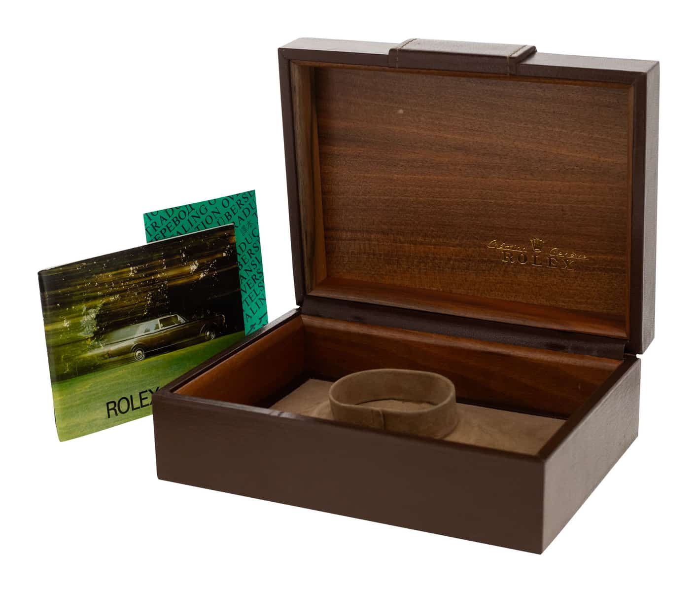 This Rolex Day-Date 1803 has a champagne baton dial and a bracelet strap. Due to age, this Rolex may not fall within our typical expected tolerances for timekeeping, and is no longer suitable for use in wet environments or submersion in water. In the interests of preserving original features, utmost care has been taken to sympathetically restore this watch. It has also been referenced against technical documents and manufacturer records where available to ensure authenticity and a clean history. One of our skilled polishing technicians has removed marks on the case and bracelet of this watch, brought about by daily wear and tear, which is why this watch does not come with the remaining manufacturer’s warranty.