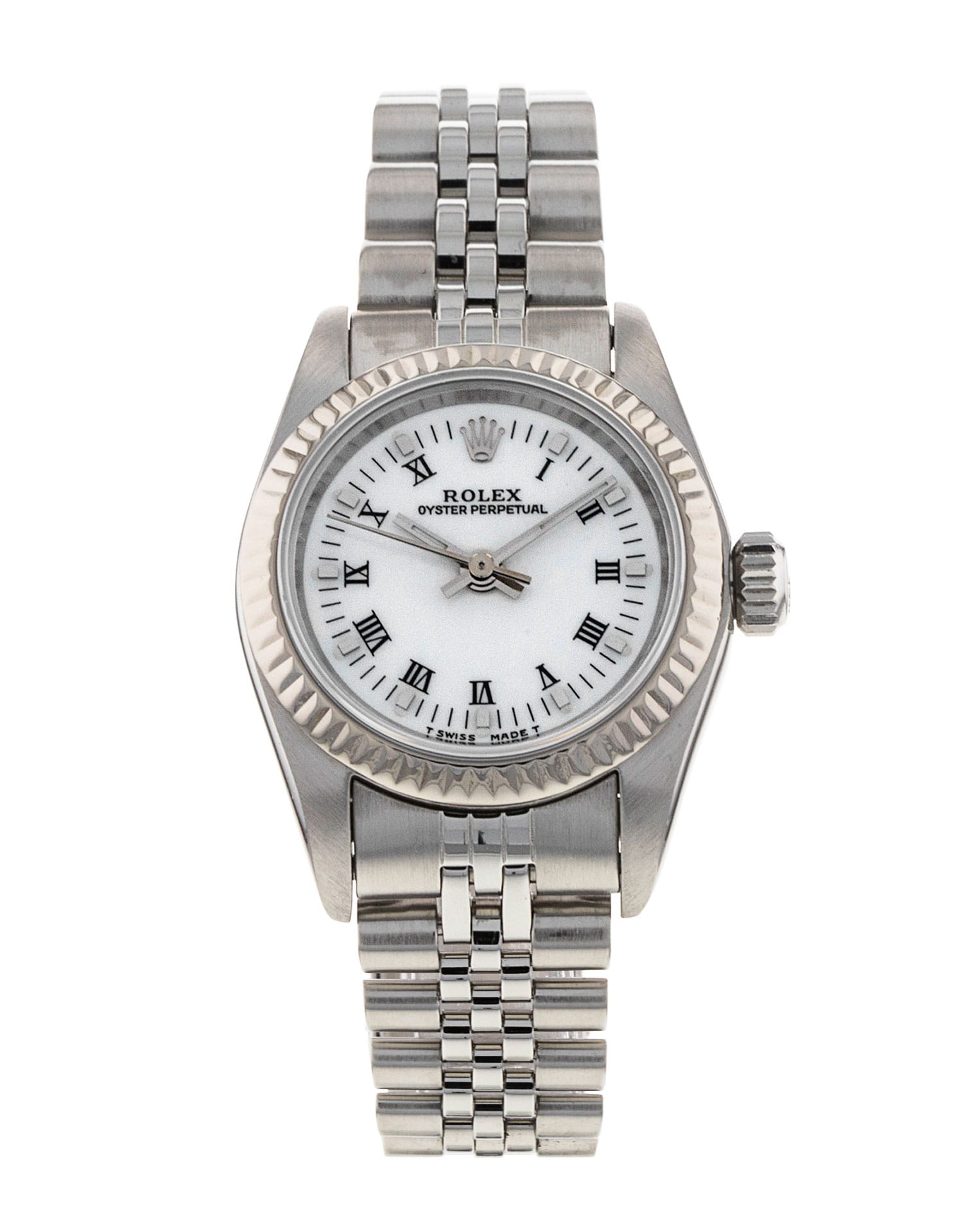 This Rolex Lady Oyster Perpetual 67194 has a white roman numeral dial and a bracelet strap. This Rolex has undergone a thorough inspection of water resistance, accuracy, functionality and condition to determine the level of reconditioning required to meet our strict standards. It has also been referenced against technical documents and manufacturer records where available to ensure authenticity and a clean history. All our watches have a 24-month warranty for your peace of mind. One of our skilled polishing technicians has removed marks on the case and bracelet of this watch, brought about by daily wear and tear, which is why this watch does not come with the remaining manufacturer’s warranty.
