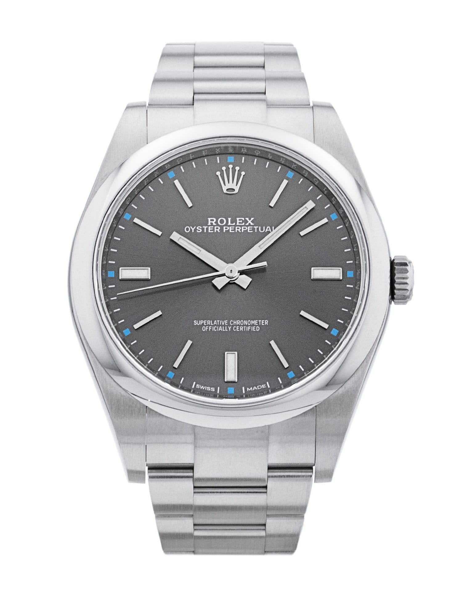 This Rolex Oyster Perpetual 114300 has a rhodium baton dial and a bracelet strap. This Rolex has undergone a thorough inspection of water resistance, accuracy, functionality and condition to determine the level of reconditioning required to meet our strict standards. It has also been referenced against technical documents and manufacturer records where available to ensure authenticity and a clean history. All our watches have a 24-month warranty for your peace of mind. One of our skilled polishing technicians has removed marks on the case and bracelet of this watch, brought about by daily wear and tear, which is why this watch does not come with the remaining manufacturer’s warranty.