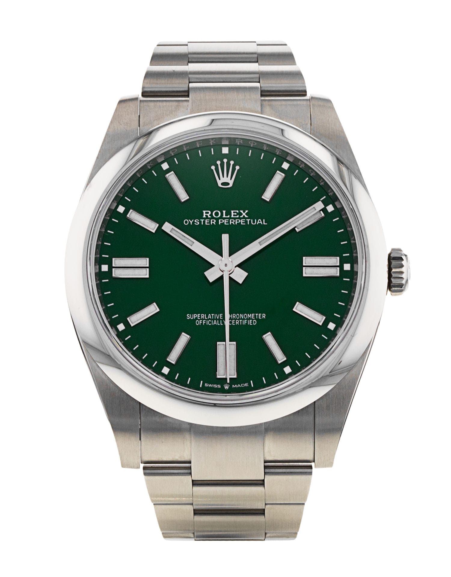 This Rolex Oyster Perpetual 124300 has a green baton dial and a bracelet strap. This Rolex has undergone a thorough inspection of water resistance, accuracy, functionality and condition to determine the level of reconditioning required to meet our strict standards. It has also been referenced against technical documents and manufacturer records where available to ensure authenticity and a clean history. Our watches have a 24-month warranty for your peace of mind, in conjunction with any remaining manufacturer’s warranty from new or from service. To maintain the manufacturer’s warranty on this watch, it has not been polished in our service centre.