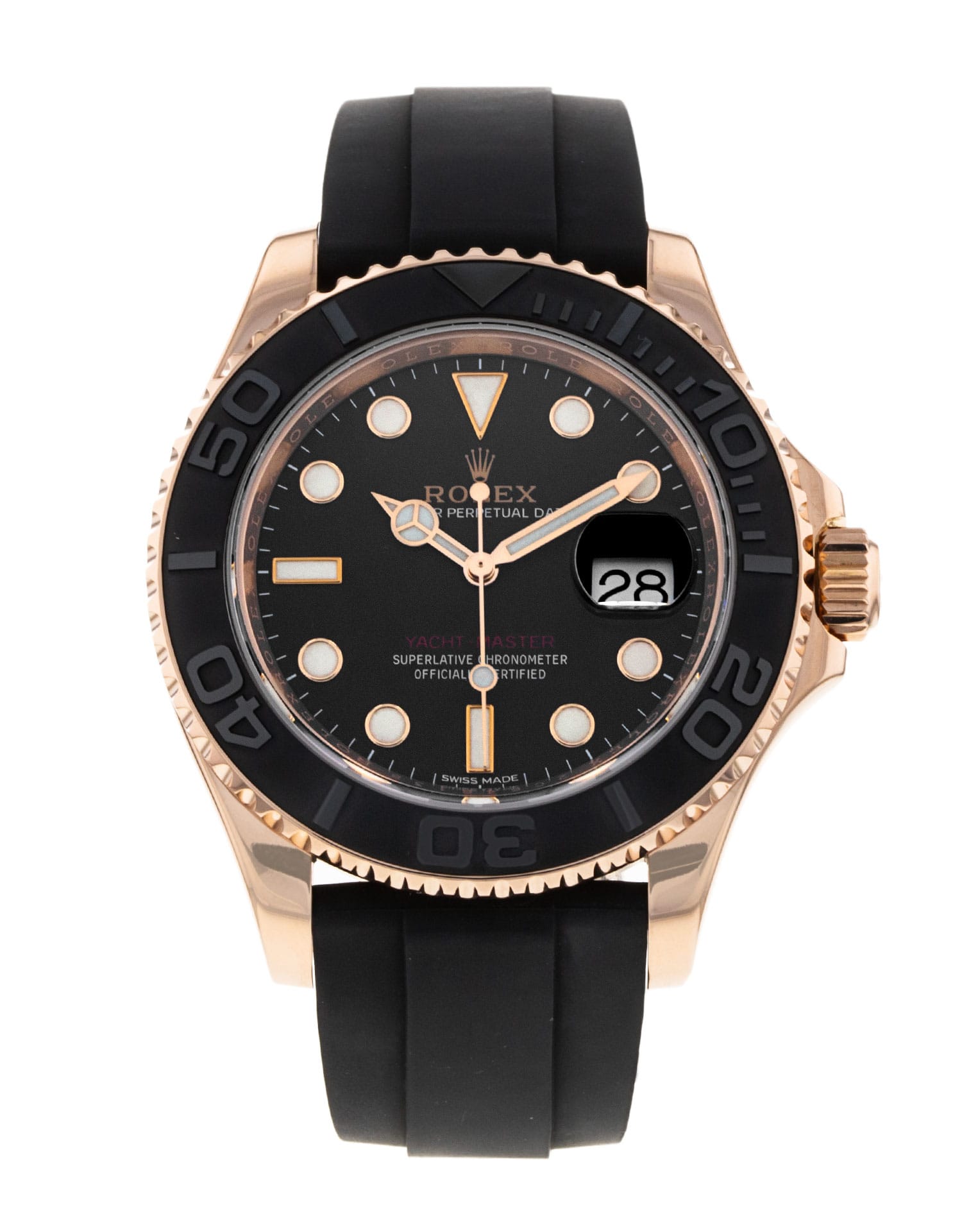This Rolex Yacht-Master 116655 has a black dial and a rubber strap. This Rolex has undergone a thorough inspection of water resistance, accuracy, functionality and condition to determine the level of reconditioning required to meet our strict standards. It has also been referenced against technical documents and manufacturer records where available to ensure authenticity and a clean history. All our watches have a 24-month warranty for your peace of mind. One of our skilled polishing technicians has removed marks on the case and bracelet of this watch, brought about by daily wear and tear, which is why this watch does not come with the remaining manufacturer’s warranty.