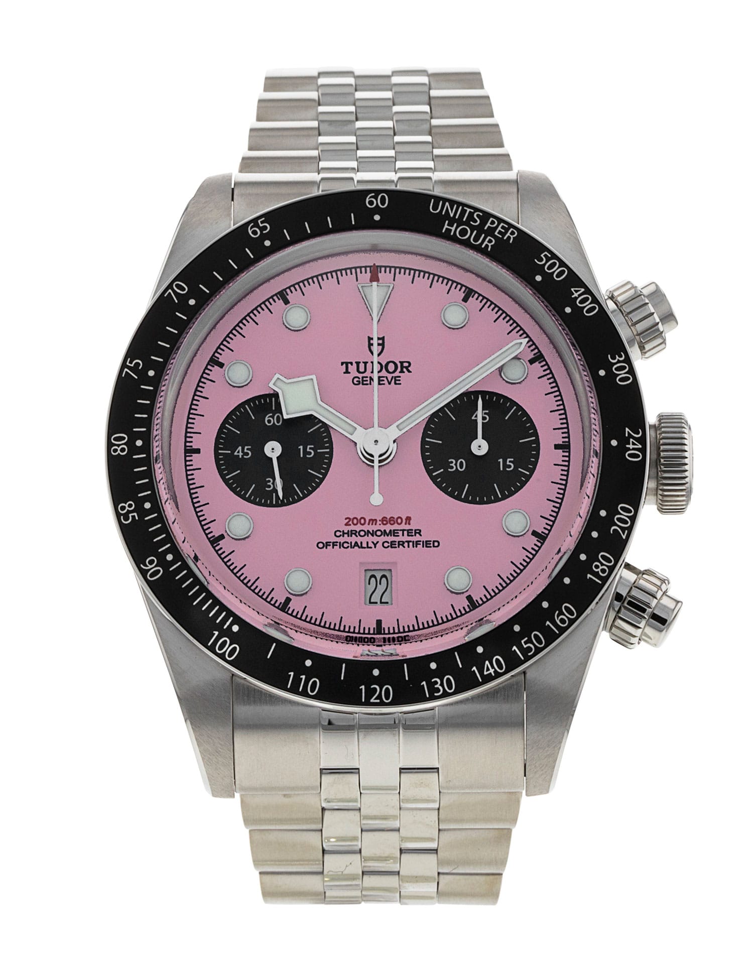 This Tudor Black Bay Chrono M79360N-0019 has a pink dial and a bracelet strap. This Tudor has undergone a thorough inspection of water resistance, accuracy, functionality and condition to determine the level of reconditioning required to meet our strict standards. It has also been referenced against technical documents and manufacturer records where available to ensure authenticity and a clean history. Our watches have a 24-month warranty for your peace of mind, in conjunction with any remaining manufacturer’s warranty from new or from service. To maintain the manufacturer’s warranty on this watch, it has not been polished in our service centre.