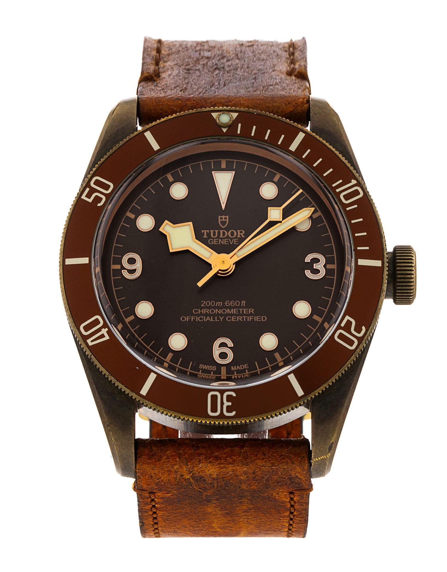 This Tudor Heritage Black Bay M79250BM-0004 has a brown quarter arabic dial and a leather strap. This Tudor has undergone a thorough inspection of water resistance, accuracy, functionality and condition to determine the level of reconditioning required to meet our strict standards. It has also been referenced against technical documents and manufacturer records where available to ensure authenticity and a clean history. All our watches have a 24-month warranty for your peace of mind. One of our skilled polishing technicians has removed marks on the case and bracelet of this watch, brought about by daily wear and tear, which is why this watch does not come with the remaining manufacturer’s warranty.